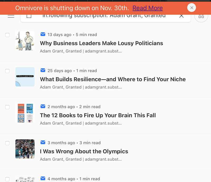 Among other nice features, Omnivore provided an email address that you could use to subscribe to your favorite newsletters. Instead of newsletters cluttering your inbox, Omnivore took care of organizing the content, which you could read at your leisure.