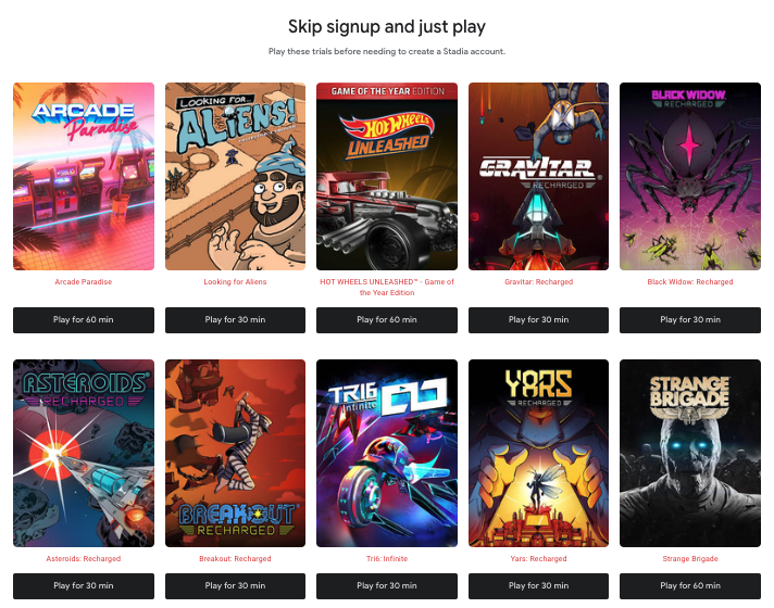 For example, Google didn’t even announce a price when Stadia launched. The offer of games was poor, they had no exclusive titles, not even an exclusive for launch day. Check the titles below, taken from Stadia’s page. Any game in the list you are desperate to play? What do you think of the page layout? Where are the game trailers? They have some very good titles, but they have no prominent space on the webpage. Scroll two or three pages down on the original Stadia page to see them.