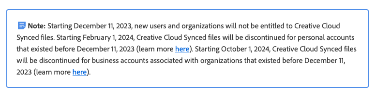 But there used to be. Adobe had a destkop app called Creative Cloud Synced Files. Similar to Dropbox, One Drive or Google Drive, the app kept your Creative Cloud folder in sync with a folder in your laptop. But Creative Cloud Synced Files was discontinued in 2024.