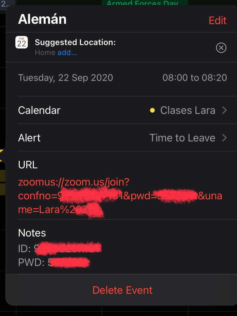Un tema frecuente durante la pandemia es que los chicos se conecten a sus clases virtuales por Zoom. Por algún motivo que desconozco, el colegio de mis hijos envia cada semana un PDF con el horario de clase, y los ID y contraseñas de las sesiones de Zoom de la semana. Pero no envían ni invitaciones para agregar a la agenda ni el link para conectarse a la reunión.